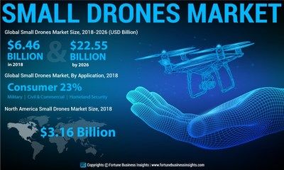 The market for small drones is projected to reach $22.55 billion by the end of 2026, according to a report recently released by Fortune Business Insights. In a paid analysis study titled “Small Drones Market Size, Share & Industry Analysis, by Type (Fixed-Wing, Rotary-Wing, and Hybrid/Transitional), By Power Source (Lithium-ion cells, Hybrid Fuel cells, and Solar cells), By Size (Micro, and Mini & Nano), By Application (Civil & Commercial, Military, Homeland Security, and Consumer) and Regional Forecast, 2015-2026” researchers predict that the 2018 $6.48 billion market will grow by 15.92% during the forecast period, 2019 to 2026. The report also states that North America is the largest market globally for small drones; but the fastest growth rate will be in the Asia Pacific region.